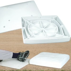 Designed to reduce sliding injuries. The base plate is designed to be smooth, streamlined, and low to the ground. There are no “nubs” or fingers that stick up from the base mounting plate to potentially catch the foot and cause injury. This allows the player to smoothly slide over the plate after the top dislodges. The pad of the base is engineered to maintain vertical rigidity to support a player standing on the base, while maximizing the horizontal flexibility so that the pad will flex on impact, and will only breakaway if the slide is too hard and may cause injury. Reset the top in seconds by simply aligning the holes in the base plate with the posts on the base top and press together.