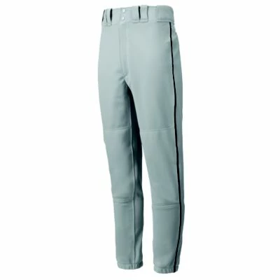 Mizuno Adult Premier Piped Baseball Pant 100% Polyester Double Knit Tunnel-belt-loop waist Fly front with extended two-snap closure Two set-in back pockets with button closure Double knee Baseball specific cut Ankle length.